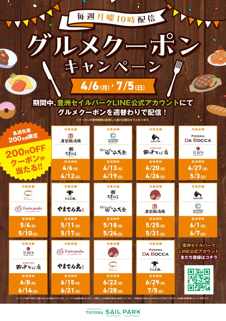 期間中、豊洲セイルパークLINE公式アカウントにてグルメクーポンを週替わりで配信!